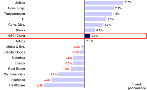 图表:上周MSCI中国指数上涨0.4%,公用事业、必选消费及交运板块领涨