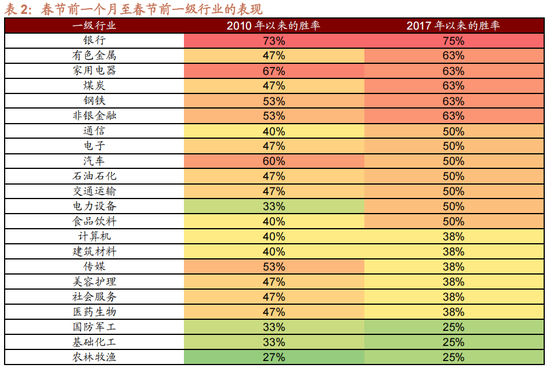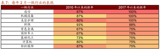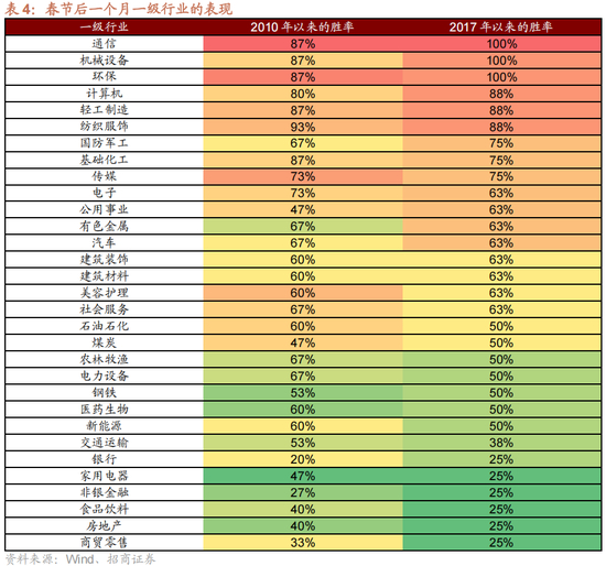 从行业表现来看,春节后,通信、机械、环保、计算机、轻工、纺织服装这种小盘股聚集的行业,上涨和获得超额收益率的概率相当高。