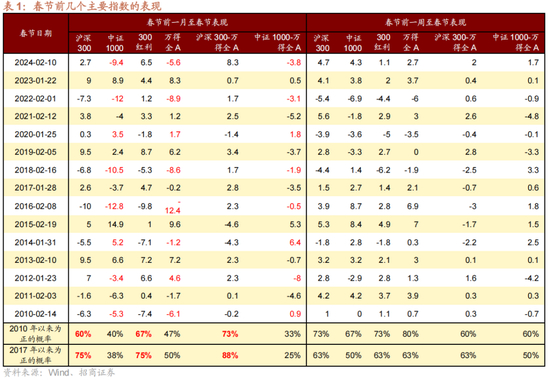 从概率上来看,较为明显的是春节前一个月至春节前,沪深300、300红利上涨的概率相对较高,而万得全A没有显著的规律,而中证1000表现相对更弱。从超额收益的角度来看,沪深300大概率跑赢万得全A,而中证1000大概率跑输。