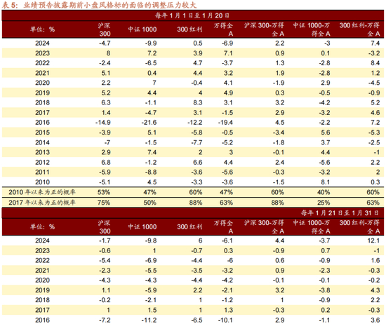 过了每年1月初就逐渐进入上市公司年报业绩预告的披露的时间窗口。在业绩预告披露期前,前期涨幅较大,估值较贵,偏主题催化的小盘风格标的面临较大的调整压力,越临近1月31日业绩预告披露截止日,调整的压力越大。业绩披露期结束后,进入业绩的相对真空期,此时,业绩问题不再掣肘股价表现,春节结束后流动性往往也是相对充裕的时候,而且临近两会的召开,此时,小盘风格开始反弹,并且开始获得明显的超额收益。