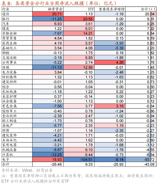 【资金·众寡】融资资金小幅净流出、ETF净流入。本周融资资金前四个交易日合计净流出45.4亿元;新成立偏股类公募基金145.6亿份,较前期上升94.8亿份;ETF净申购,对应净流入15.1亿元。行业偏好上融资资金净买入通信、电子、汽车等;医药ETF申购较多,信息技术ETF赎回较多。