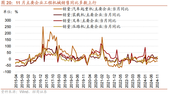 11月主要企业工程机械销售当月同比多数上行。11月主要企业装载机销量同比由正转负至-0.01%(前值为14.70%),三个月滚动同比增幅收窄5.1个百分点至7.50%;主要企业叉车销量同比增幅扩大4.63个百分点至5.07%,三个月滚动同比增幅扩大1.27个百分点至3.86%;主要企业压路机销量同比由负转正至19.40%(前值为-4.32%),三个月滚动同比增幅扩大2.63个百分点至6.31%;主要企业汽车起重机销量同比跌幅扩大0.90个百分点至-15.90%,三个月滚动同比跌幅扩大2.95个百分点至-17.77%;主要企业内燃机销量同比增幅扩大5.89个百分点至13.47%,三个月滚动同比增幅扩大3.69个百分点至9.15%。
