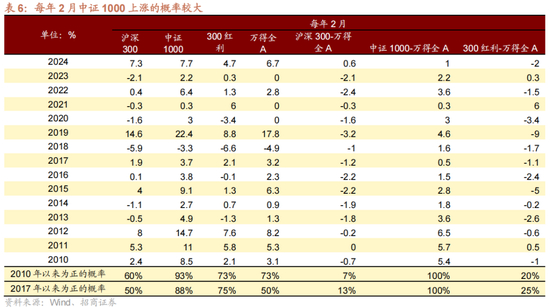 因此,每年2月,中证1000上涨的概率较大,同时获得超额收益的概率也非常明显;反之,沪深300上涨概率明显下降,跑输的概率也非常明显。