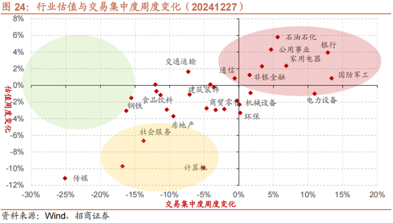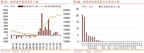 在行业估值方面,本周板块估值涨跌分化,其中,国防军工、通信和石油石化估值涨幅居前,社会服务、计算机和传媒跌幅居前。国防军工板块估值上涨0.67至61.2,处于55.3%历史分位;通信板块估值上涨0.47至21.7,处于29.3%历史分位;石油石化板块估值上涨0.56至11.5,处于28.9%历史分位;社会服务板块估值下跌1.11至23.7,处于3.9%历史分位;计算机板块估值下跌1.04至48.9,处于57.7%历史分位;传媒板块估值下跌1.45至26.4,处于50.2%历史分位。截至12月27日收盘,一级行业估值排名前五的行业分别是国防军工、计算机、电子、美容护理、医药生物。