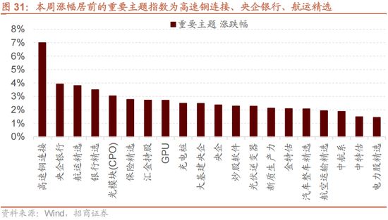 本周A股市场涨跌分化,万得全A下跌0.61%,沪深300上涨1.36%,创业板指下跌0.22%。A股涨幅居前的重要主题指数为高速铜连接、央企银行、航运精选。