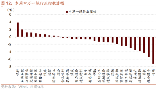 从行业上看,本周申万一级行业涨少跌多,银行、石油石化和公用事业等板块表现较好,计算机、社会服务、传媒等板块跌幅居前。从涨跌原因看,本周看跌板块及主要原因,银行(临近业绩披露期,避险情绪升温,红利占优)、石油石化(临近业绩披露期,避险情绪升温,红利占优)、公用事业(临近业绩披露期,避险情绪升温,红利占优);跌幅较大的行业及主要原因:传媒(前期涨幅过高,正常回调),社会服务(获利资金兑现),计算机(市场风格切换,业绩期避险)。