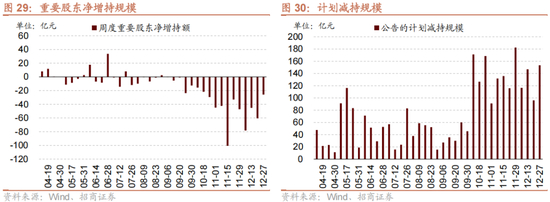 从资金需求来看,重要股东净减持规模缩小,计划减持规模提升。本周重要股东二级市场增持19.0亿元,减持45.0亿元,净减持25.9亿元,净减持规模缩小。其中,净增持规模较高的行业包括公用事业、有色金属、房地产等;净减持规模较高的行业包括电子、基础化工、医药生物等。本周公告的计划减持规模为153.6亿元,较前期提升。