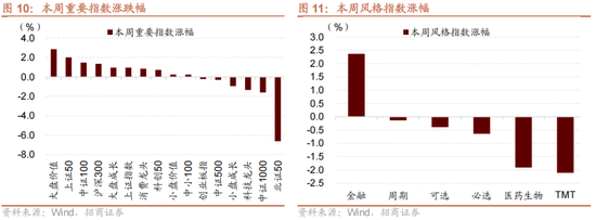 本周A股市场主要指数涨多跌少,主要指数中,大盘价值和上证50领涨,分别上涨2.86%和2.01%;北证50、中证1000领跌,分别下跌1.60%和6.62%。