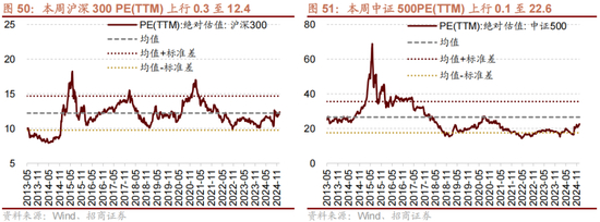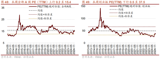 本周全部A股估值水平上行。截至12月27日收盘,全部A股PE(TTM)为15.4,处于历史估值水平的51.5%分位数。创业板PE(TTM)下行0.5至37.5,处于历史估值水平的26.5%分位数。代表大盘股的沪深300指数PE(TTM)上行0.3至12.4,处于历史估值水平的60.2%分位数。代表中小盘股的中证500指数PE(TTM)上行0.1至22.6,处于历史估值水平的39.3%分位数。