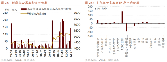 从ETF净申购来看,ETF净申购,宽指ETF均为净赎回,其中科创50ETF赎回最多;行业ETF申赎参半,其中医药ETF申购较多,信息技术ETF赎回较多。具体来看,股票型ETF总体净申购42.5亿份。其中,沪深300、创业板ETF、中证500ETF、上证50ETF、双创50ETF和科创50ETF分别净赎回10.4亿份、净赎回8.2亿份、净赎回4.3亿份、净赎回1.5亿份、净申购144.5亿份、净赎回93.2亿份。行业方面,信息技术ETF净赎回32.7亿份;消费ETF净赎回4.5亿份;医药ETF净申购19.7亿份;券商ETF净申购13.1亿份;金融地产ETF净申购4.1亿份;军工ETF净申购0.8亿份;原材料ETF净赎回1.6亿份;新能源&智能汽车ETF净申购3.3亿份。