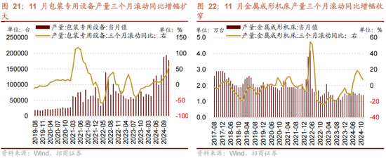 1-11月包装专用设备产量累计同比增幅扩大,三个月滚动同比增幅扩大。1-11月包装专用设备产量累计值为143.52万台,同比增幅扩大6.3个百分点至19.40%;11月包装专用设备产量当月值为17.85万台,同比增幅扩大76.4个百分点至95.60%,三个月滚动同比增幅扩大27.37个百分点至57.40%。