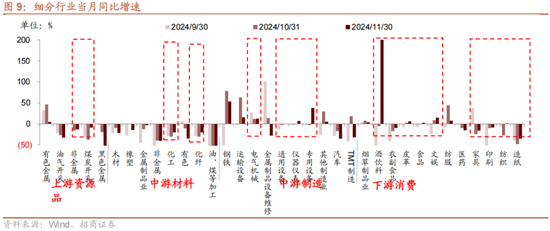 ◾消费品制造业增速普遍改善。11月份消费品制造业利润同比增长22.0%,拉动全部规上工业利润增长3.7个百分点,13个消费品制造业中有8个行业利润同比增长。其中酒饮料茶行业利润同比增长292.3%;化纤、文教工美、纺织服装等行业利润均保持较快增长,同比分别增长16.3%、14.7%、8.2%。家电、家装、厨卫等领域受以旧换新政策拉动明显,家用清洁卫生电器具制造、家用制冷电器具制造、耐火陶瓷制品及其他耐火材料制造、家用空气调节器制造等行业利润分别增长311.4%、82.9%、25.0%、11.1%。