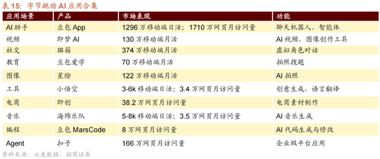 字节跳动目前已成为国内最广泛布局AI产业的公司之一,大模型,硬件和应用软件均有产品落地。在大模型侧,字节跳动已覆盖文字,音频,视频等全模态的大模型矩阵,在硬件侧,公司已发布AI智能体二级Ola Friend;在应用软件件侧,字节跳动目前已上线超20款AI产品,包括视频,图片,虚拟对话等多个场景,覆盖几乎所有的热门AI应用赛道。