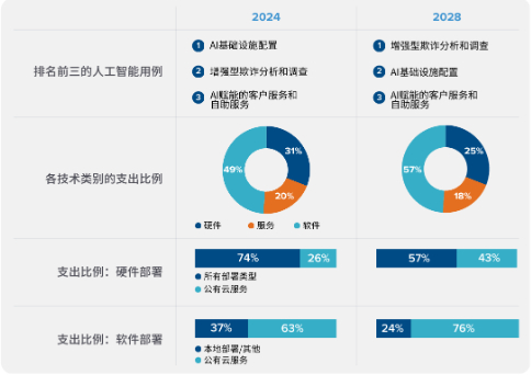 根据IDC数据,人工智能支出排名前三的行业是软件和信息服务、银行及零售业,预计在2024 年的AI投资达896亿美元,占全球市场的38%。银行业将显著增加对欺诈分析和调查等AI服务的需求。而软件开支未来在人工智能支出中占比最高,预计将显著带动IAAS、SAAS、PAAS等云端服务市场的增长。