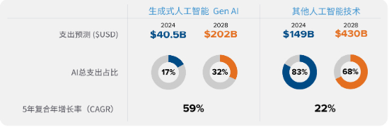 IDC预计2024年全球人工智能资本开支达2350亿美元,并预计2028年增长至6320亿美元,复合增速达29%。此外生成式人工智能资本开支2024-2028年GAGR有望达59%,显著高于其他人工智能技术的22%。