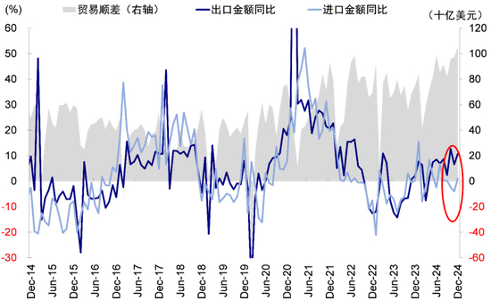 ► 分子端,国内经济和金融数据受政策支持边际改善,只不过持续性有待观察。一方面,整体经济量价分化,2024年四季度实际GDP同比增长5.4%,超出市场预期的5.1%,支撑全年实际GDP同比达到5%,完成年初目标,但名义GDP仅同比增长4.2%。另一方面,出口虽亮眼但主要受益于对美抢出口,消费韧性则主要依靠两新等刺激措施:1)出口强劲但或存在前置,12月出口同比增长10.7%,高于11月的6.7%和市场预期的7.5%,其中对美出口金额同比走高至15.6%,美东航线运价指数明显上行;2)消费韧性受两新政策支持,12月社零同比增长3.7%,好于11月的3.0%,其中家电同比增长39.3%是主要贡献;3)生产同比增速较高,同样反映政策支持,12月工业增加值和服务业生产指数分别小幅回升至6.2%和6.5%,受消费和出口支撑中游表现好于上游。4)新房销量平稳,但也需要关注政策效果回落后跟进措施,12月商品房销售面积同比下降0.5%(vs. 11月+3.2%),销售额同比增长2.4%(vs. 11月+1%),高频数据显示一二手房销售面积同比增幅收窄,上海、广州等城市二手房挂牌价回落,政策效果或在逐渐退坡。