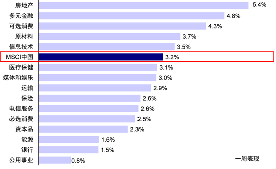 图表:上周MSCI中国指数上涨3.2%,房地产、多元金融、可选消费等板块领涨