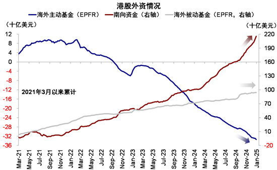 此外,1月13日潘行长在亚洲金融论坛提出,要提高外储在香港的资产配置比例[4],也是市场情绪改善的直接催化剂之一。考虑到外储只能在海外配置的约束[5],港币锚定美元的联系汇率制度,这一安排的确存在可行性。但进一步的配置细节,如3万亿美元的外储在港将增配多少,具体配置方向(港股还是离岸债券),如何管理波动,仍有待厘清。作为对比,南向资金2024年全年流入超过1000亿美元。考虑到港股较低迷的流动性,外储如果在港股市场增加配置,将至少对情绪和流动性都有积极作用。