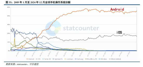 iOS:同样在安卓系统正式发布的2007年,苹果发布了搭载iOS系统的第一代iPhone,开启了智能手机的新时代。相较于安卓的开放,苹果iOS系统采用封闭式生态,严格把控软件审核环节,一定程度限制了系统的灵活性,但为用户提供了一致且高质量的使用体验。从市场份额看,近年来iOS系统的市占率相对稳定,2024年12月市场份额为26.04%,低于2009年1月iOS的市场份额35.56%。