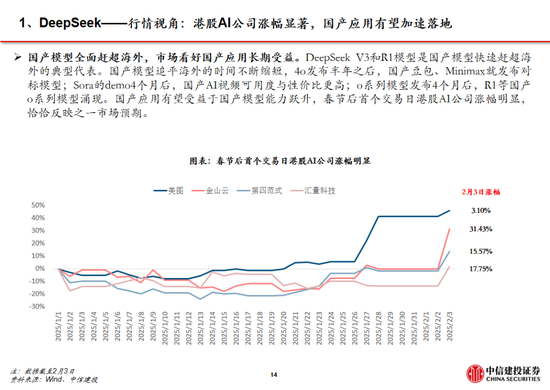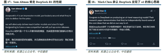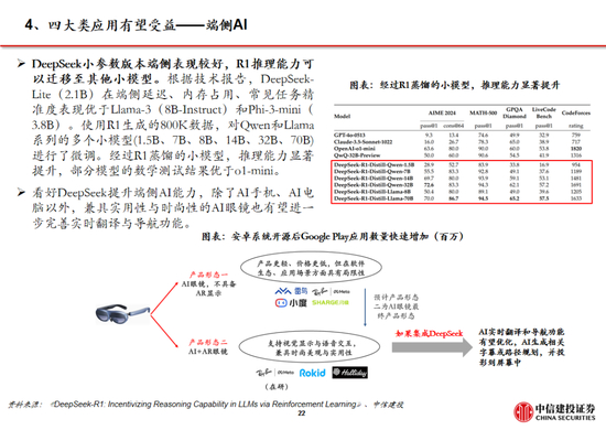 我们认为,DeepSeek-R1作为开源模型性能接近头部闭源模型o1,一定程度上已经反映了AI平权。实际上,过去OpenAI的领先更多基于先发优势,而当开源模型的性能实现对闭源模型的追赶,全球的团队的研发能力能够使开源模型的性能始终位于前列。近期各研究团队对R1模型的积极复现更是侧面验证了开源模式的优势。此外,DeepSeek-R1使小模型具备推理能力成为可能,更低的成本将更有利于开发者探索AI的实际落地,带来更有价值的产品。