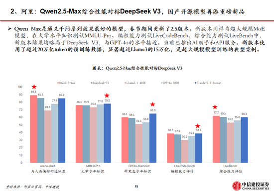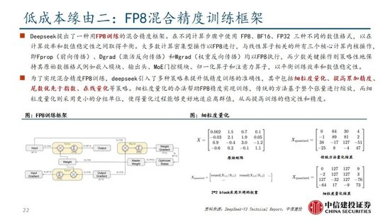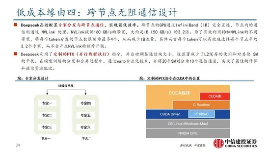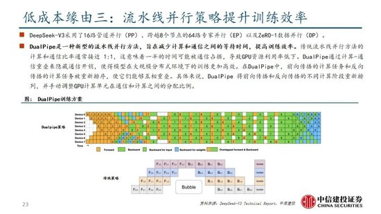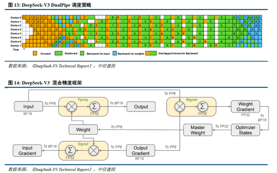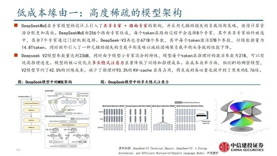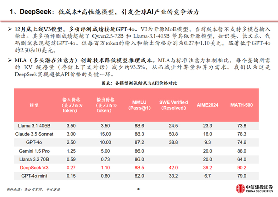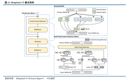 算法迭代、架构升级促进DeepSeek-V3模型训练成本降低,符合产业趋势。相较于GPT-4和o1模型,DeepSeek-R1的基础模型DeepSeek-V3训练成本明显更低,结合V3技术报告和上述计算过程,我们认为成本优化主要缘于:1)V3模型通过DeepSeekMoE架构(3.1中将进一步说明),使用更细粒度专家模型,同时隔离部分共享专家,提高计算资源利用率,激活参数少(仅37B),算力消耗低;2)V3模型采用MLA算法(3.1中将进一步说明),通过低秩联合压缩注意力键值,减少推理时的键值(KV)缓存,降低计算量;3)Dual Pipe框架实现高效流水线并行,或显著提高GPU利用率;4)DeepSeek提出了一种利用FP8数据格式进行训练的细粒度混合精度框架,通过低精度训练优化训练效率。