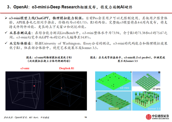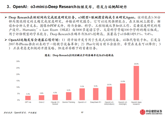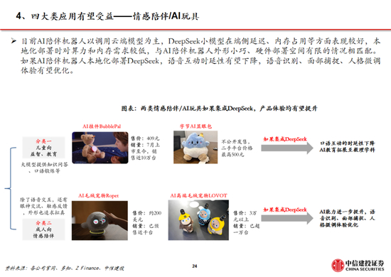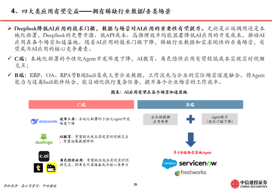 考虑到DeepSeek-R1开发和调用成本本身较低,还通过蒸馏的方式带来了小模型推理能力的提升,则应用开发者能够以更低的成本部署模型或调用API,并保持相对优秀的性能。当应用开发门槛降低,预计会出现更多产品探索方向,直至出现具有突破性的 “killer”应用。同时,DeepSeek-R1的低价,同样有望带来推理模型新一轮的价格战(o3-mini的价格本身已经验证了这一观点),为开发者带来更多性价比之选。最后,当DeepSeek模型的能力达到全球第一梯队后,其作为国内厂商能为国内应用开发者提供更稳定的服务(调用GPT API可能会受到各种限制),亦将促进各类应用产生。