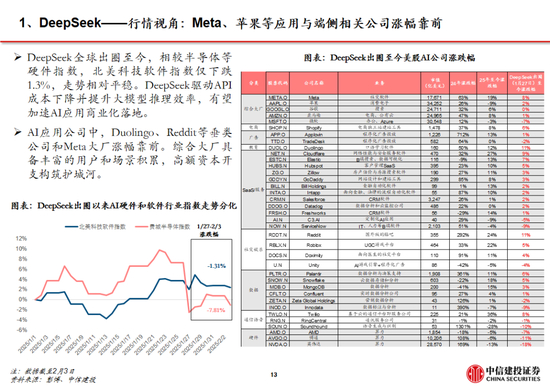 应用:DeepSeek-R1有望引发新一轮大模型API降价,小模型通过蒸馏具备强劲推理能力,这也将促使开发者探索更多应用落地的可能性。AI应用作为新一代生产力工具,看多C端软件的持续发展,B端应用软件商业化进展更快。建议关注B端Agent,其中OA+ERP作为核心入口,AI结合更易,有望率先商业化,其次关注用户量多、生态好且可云化的软件公司等。
