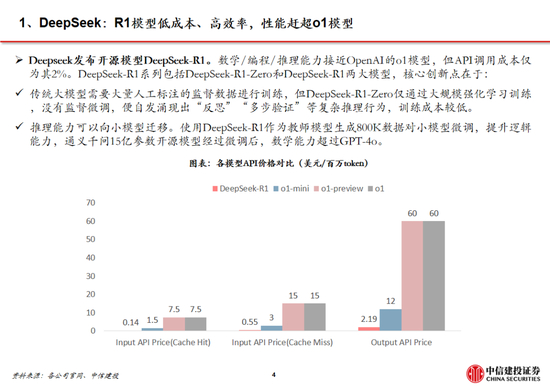 R1作为开源模型性能接近头部闭源模型o1,一定程度上已经反映了AI平权。同时,R1使小模型具备推理能力成为可能,更低的成本将更有利于开发者探索AI的实际落地。