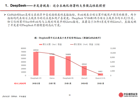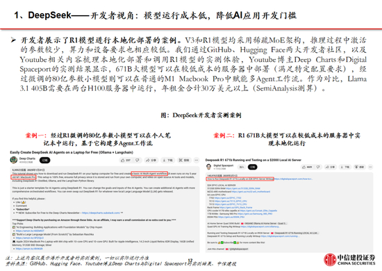 回顾安卓与iOS应用的发展,我们率先提出不应只关注大模型本身的用户数及活跃度,更应该关注开发者,尤其是中小开发者的数量。据GitHub,在Llama比DeepSeek开源时间早1年半的情况下,目前DeepSeek R1在GitHub上的开发者点赞数量已经达到约5.7万,接近Llama。根据GitHub、Hugging Face社区上的开发者实测,经过R1微调的80亿参数小模型可以在个人笔记本中运行,本地化部署门槛显著下降,应用的开发将迎来百花齐放。