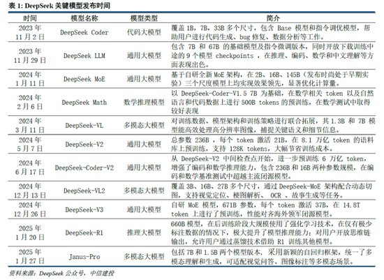 DeepSeek坚定开源路线,密集更新MoE、推理、多模态模型。近期,DeepSeek连续发布并开源多个大模型,其低成本、高性能的特性迅速引发全球用户的关注。其中,2024年12月26日发布的DeepSeek-V3为671B参数的自研 MoE 模型,运行时仅需激活37B,在 14.8T token 的数据上进行了预训练;2025年1月20日发布的DeepSeek-R1为660B的高性能推理模型,对用户开放思维链输出,允许用户通过蒸馏技术借助 R1 训练其他模型;2025年1月27日,DeepSeek在Hugging Face平台上传了视觉模型 Janus-Pro和多模态理解模型JanusFlow -1.3B,进一步在图像领域发力。
