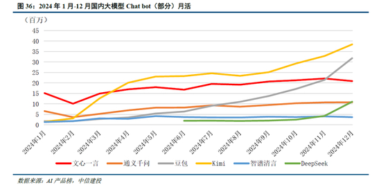 虽然春节期间Deepseek的关注度赶超字节豆包,但我们认为以字节跳动为代表的中国头部互联网公司,手握高粘性+大DAU产品,叠加强产品能力。在第二阶段的应用、场景等领域,用户数+产品力+商业变现能力,仍然将帮助他们在接下来的竞争中抢占先机。