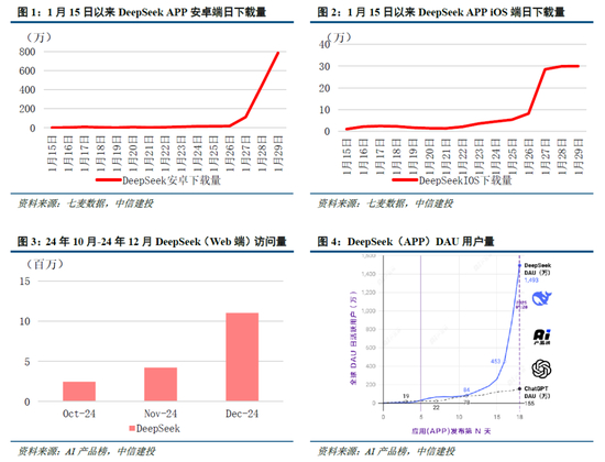 我们认为,DeepSeek用户数将持续高速增长。一方面DeepSeek作为开源路线的坚定践行者,有望受到全球开发者的高度关注;另一方面受益于春节期间信息传播下沉,DeepSeek的国内渗透率将持续提升。