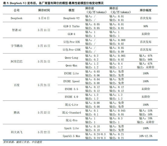 应用:DeepSeek-V3/R1作为通用/推理方面的基础模型,性能升级及在各类 Benchmark 跑分中的提高,本身就为应用落地带来了更大的可能性。然而,对于开发者而言,更关键的点在于模型能够和应用适配调优,提供稳定性的API服务,以及性价比更高的tokens成本。参考2024年5月DeepSeek-V2发布后带来的大模型价格战,即使模型成本更高,字节、阿里等大厂亦按照烧钱补贴的逻辑大幅降价,本质上是因为开发者价格敏感,大厂愿意亏钱抢占市场份额,培育开发者使用习惯。