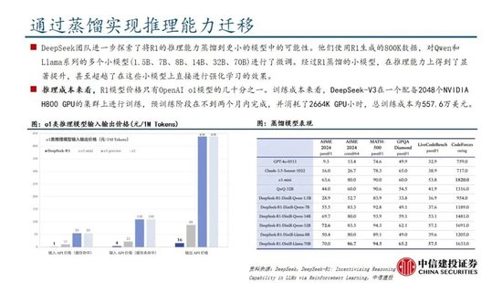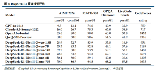 蒸馏使小模型具备较强逻辑推理能力的思路或与OpenAI o1-mini不同。据张俊林分析,o1系列模型更可能是重新训练的(OpenAI多次强调o1-mini逻辑推理能力强,但在世界知识方面弱;如果其基于GPT系列模型而来,世界知识应该不会弱于GPT 4o-mini),而DeepSeek-R1则是在V3的基础上通过强化学习训练得到。因此,DeepSeek通过向更高效的小模型蒸馏DeepSeek-R1的输出,显著提升小模型推理能力,更可能走出了与OpenAI o1-mini不同的道路,从而实际上打破了之前“小模型逻辑推理能力难以通过蒸馏提升”的研究结论。