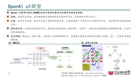 思维链等方式打开推理侧大模型能力提升空间。当训练侧“Scaling law”进度相对放缓,OpenAI于2024年9月发布了系列新模型o1,其利用强化学习技术,通过提高推理侧的思考时间,大幅优化了模型表现;还能够在训练过程中生成高质量数据,解决天然数据缺失的问题。以思维链技术为例,其类比人类思考过程,使大模型在推理过程中把复杂问题拆解成若干简单步骤,从用户提出的问题出发,逐步生成正确答案。OpenAI o1模型性能随着训练时间和测试时间计算而平稳提升,后训练及推理阶段思考深度(时间)或将成为 新的“Scaling law”;相较于OpenAI未开源推理算法,DeepSeek-R1系列模型提供了RL Scaling Law的可行方向,有望促进各厂商跟进并继续探索其他推理侧拓展方向。