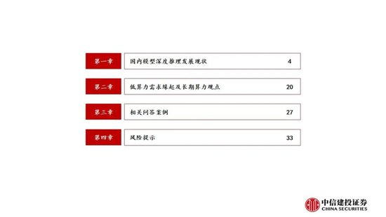 风险提示:(1)AI产业商业化落地不及预期:目前各环节AI 产品的商业化模式尚处于探索阶段,如果各环节产品的推进节奏不及预期,或对相关企业业绩造成不利影响;(2)市场竞争风险:海外 AI 厂商凭借先发优势,以及较强的技术积累,在竞争中处于优势地位,如果国内 AI 厂商技术迭代不及预期,经营状况或将受到影响;同时,目前国内已有众多企业投入AI产品研发,后续可能存在同质化竞争风险,进而影响相关企业的收入;(3)政策风险:AI技术的发展直接受各国政策和监管影响。随着AI在各个领域的渗透,政府可能会进一步出台相应的监管政策以规范其发展。如果企业未能及时适应和遵守相关政策,可能面临相应处罚,甚至被迫调整业务策略。此外,政策的不确定性也可能导致企业战略规划和投资决策的错误,增加运营的不确定性;(4)地缘政治风险:在全球地缘政治环境的波动下,尤其美国对中国的出口限制或将直接影响国内企业算力芯片的获取,进而影响其产品研发和市场竞争力。同时,地缘政治风险也可能导致 AI 产品开拓海外市场面临障碍,影响相关企业的营收情况。