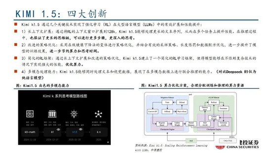 国产模型迈向深度推理,策略创新百花齐放。在Deepseek R1-Zero模型中,采用的强化学习策略是GRPO策略,取消价值网络,采用分组相对奖励,专门优化数学推理任务,减少计算资源消耗;KIMI 1.5采用Partial rollout的强化学习策略,同时采用模型合并、最短拒绝采样、DPO 和long2short RL策略实现短链推理;Qwen2.5扩大监督微调数据范围以及两阶段强化学习,增强模型处理能力。