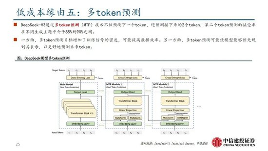 多token预测(MTP):主流大模型token-by-token生成序列,而每次token生成需要频繁与访存交互,从而因为访存效率形成训练或推理的瓶颈。MTP方法主要将单token的生成,转变成多token的生成,提升训练和推理的性能。DeepSeek主要对过往MTP算法进行了一定优化,顺序预测额外token,并在每个预测深度保持完整的因果链。