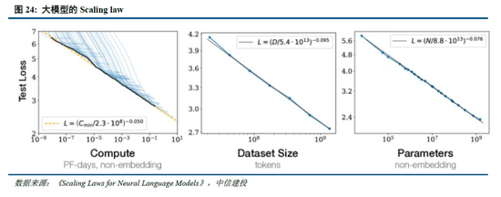 训练侧Scaling law推动模型能力持续提升,但仍面临技术、算力、数据的制约。早在2020年,OpenAI即在论文中提出了“Scaling law”,其内涵在于大模型的最终性能主要与计算量、模型参数量和训练数据量三者的大小相关,而与模型的具体结构(层数/深度/宽度)基本无关。在“Scaling law”的思路下,业内追求在训练侧用更多的高质量数据,训练更大参数规模的模型,尤其在MoE架构并行计算的加持下,大模型参数甚至能够提升至万亿以上,极大程度提高了模型的效果。