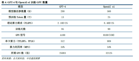 根据我们测算,GPT-4需要2.5万张A100训练95天(5700万A100 GPU小时),OpenAI o1需要用3.2万张H100训练90天(6912万H100 SXM GPU小时):1)GPT-4由16个111B的MoE模型构成,其中两个用于向前传播,另有55B被用做注意力机制的共享,则GPT-4的激活参数量约为280B,我们假定o1模型激活参数量是GPT-4的两倍,达到560B;2)GPT-4的预训练数据集token量为13B,我们假定o1模型接近其两倍,达到25B;3)GPT-4的训练时间约为90-100天,我们取中间值95天,并假定o1的训练周期为90天;4)GPT-4的GPU利用率在32%到36%之间,我们取中间值34%,并假定o1 GPU利用率也为34%;5)根据OpenAI在Scaling Laws 论文中给出的经验公式计算(C = rT ≈ 6*P*D,P为模型参数量,D为训练集token大小,r为训练集群硬件FLOPS总吞吐),则OpenAI o1预训练需要用3.2万张H100。