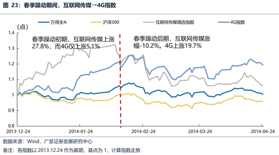 (1)2014年春季躁动第一波上涨的是互联网传媒。宏观基本面缺乏增量信息,主题行情活跃,春季躁动初期,互联网传媒上涨27.8%,而4G仅上涨5.1%;春季躁动后期,互联网传媒涨幅-10.2%。4G上涨19.7%。