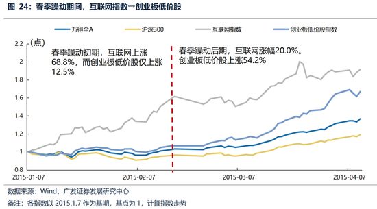 (1)2015年春季躁动第一波上涨的是互联网。第一阶段,由于政策催化(“互联网+”写入政府工作报告)、金融创新预期升温,1-2月计算机(软件+互联网金融)领跑,计算机板块(尤其是互联网金融、云计算、信息安全)涨幅居前,龙头如东方财富、同花顺、恒生电子等翻倍。春季躁动初期,互联网上涨68.8%,而创业板低价股仅上涨12.5%。