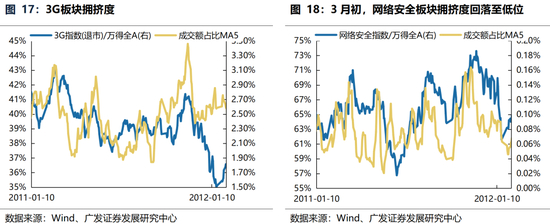 (1)2011年春季躁动期间出现明显的板块轮动,行情会轮动至出现热点、拥挤度相对较低的板块。春季躁动期间3G板块率先上涨,春季躁动初期(2.2~3.3),3G指数上涨10.5%。网信办挂牌成立,互联网信息安全成为两会热议,叠加网络安全板块拥挤度明显下降,风格切换至网络安全,春季躁动后期(3.4~3.24),3G指数上涨1.9%。网络安全上涨12.1%