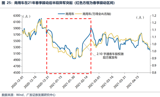 21年春季躁动启动较早,20年年底以光伏、风电、锂电为代表的新能源在1月反弹区间占优,相比之下,商用车表现弱势,而进入2月后,商用车开始回暖,随着宇通客车股权激励方案在中旬推出,板块情绪被点燃,并在短短几个交易日内快速拉高,但随后在美债利率上行、核心资产泡沫破碎的情况下,行情也跟随春季躁动的结束。