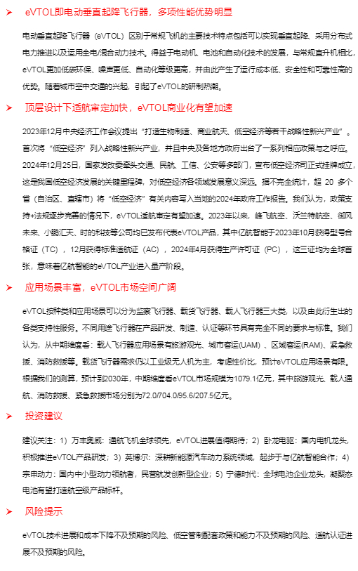 建议关注:1)万丰奥威:通航飞机全球领先,eVTOL进展值得期待;2)卧龙电驱:国内电机龙头,积极推进eVTOL产品研发;3)英博尔:深耕新能源汽车动力系统领域,起步于与亿航智能合作;4)宗申动力:国内中小型动力领航者,民营航发创新型企业;5)宁德时代:全球电池企业龙头,凝聚态电池有望打造航空级产品标杆。
