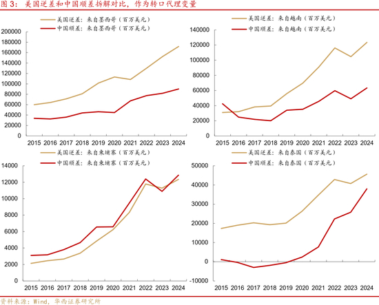 美国对主要贸易伙伴加征关税,可能还会影响转口贸易。转口数据,由于缺乏有效的直接跟踪方法,估算存在困难,我们通过分解美国逆差和中国顺差来间接衡量。按来源国(主要贸易伙伴)计算2023-2024美国逆差平均值,相对2015-2017的变化。类似地,按来源国计算中国2023-2024顺差平均值,相对2015-2017的变化。