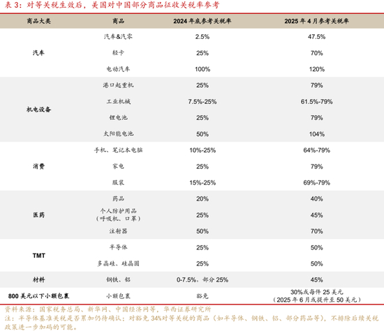 本次加征关税后,消费类商品(如消费电子、家电)和机电设备(如起重机、工业机械、太阳能电池等)出口或将受到冲击。一方面,这些商品为我国出口重点商品,从2025年1-2月出口情况来看,机电产品(内含手机、家电等)出口金额达3237亿美元,占1-2月出口比例接近60%,在2025年以来的贸易摩擦中遭受冲击的范围较大。另一方面,其中大部分商品分别在2月、3月和4月分别被加征10%、10%和34%关税,属于本轮贸易摩擦被加征关税较多的方向。此外,800美元以下小额包裹的关税由豁免状态提升至30%或每件25美元,甚至在6月可能将固定关税提升至每件50美元,或将同样对消费类商品造成冲击,如跨境电商、玩具、电子产品等。