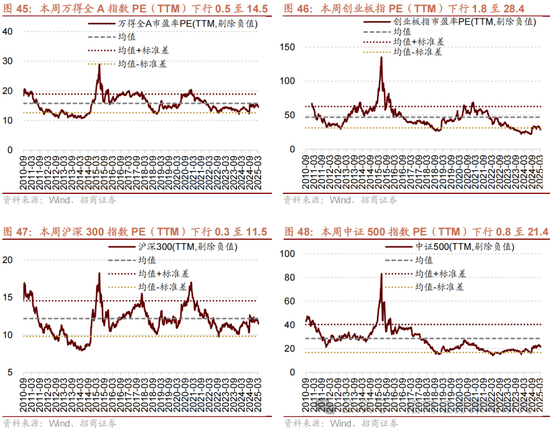 本周整体A股估值水平下行。截至4月11日收盘,万得全A指数PE(TTM)为14.5,处于历史估值水平(10年以来)的41.5%分位数。创业板指PE(TTM)下行1.8至28.4,处于历史估值水平的8.6%分位数。代表大盘股的沪深300指数PE(TTM)下行0.3至11.5,处于历史估值水平的41.9%分位数。代表中小盘股的中证500指数PE(TTM)下行0.8至21.4,处于历史估值水平的35.1%分位数。