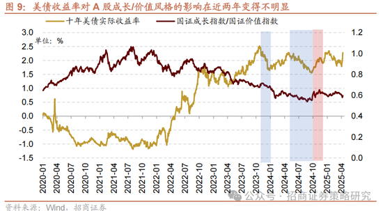 就美债收益率对A股的影响来说,2016年-2021年外资加速流入A股阶段,外资对A股拥有一定程度边际定价权,因此美债收益率对A股影响明显,尤其与A股成长/价值风格的切换高度相关。但2022年之后,外资流入放缓,美国十年期国债收益率的变化对A股的边际定价能力削弱,美债收益率对A股的影响开始变得不明显。