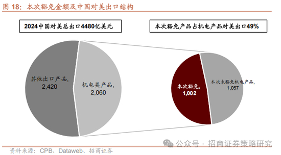 此次豁免意义重大。从结构上看,中国2024年对美出口4480亿美元,其中机电类产品(HS84机械设备、HS85电子产品)占据半壁江山,达2060亿美元,而本次1002亿美元豁免全部集中在机电类产品,占机电类产品对美出口金额的49%。从产业链上看,最受市场关注的苹果链及英伟达链均在此次豁免范围内。从主要产品来看,中国对美出口金额前十产品中,六类产品受到本次政策豁免,而锂电池、耳机及家电类产品未受豁免。